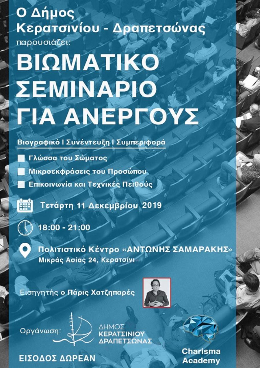 Ο Δήμος Κερατσινίου- Δραπετσώνας διοργανώνει με εισηγητή τον Πάρι Χατζηπαρέ, Βιωματικό Σεμινάριο για Ανέργους, την Τετάρτη 11 Δεκεμβρίου στις 18.00 με 21.00, στο πολιτιστικό κέντρο "Αντ. Σαμαράκης" (Μ. Ασίας 24).